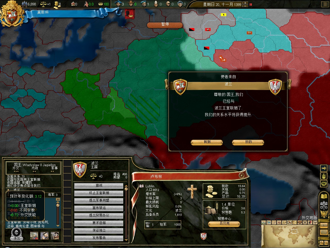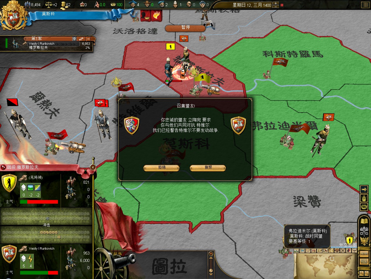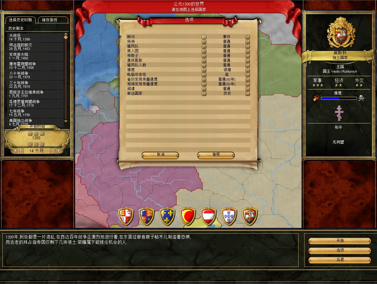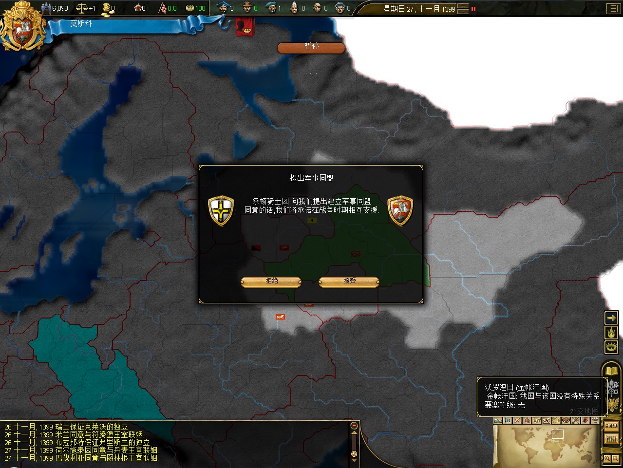 开局拉一格中央,其实这是坏习惯,莫斯科初始才5000兵,但如果拉出叛乱在莫斯科,刷出1w3的叛军,可以直接重开了。不过这次运气不错,叛军在卡卢加,还是篡权叛军。这样正好帮我挡住了立陶宛的两股民族主义叛军。民族主义叛军占领后会加十年的民族主义,而篡权叛军没惩罚。
