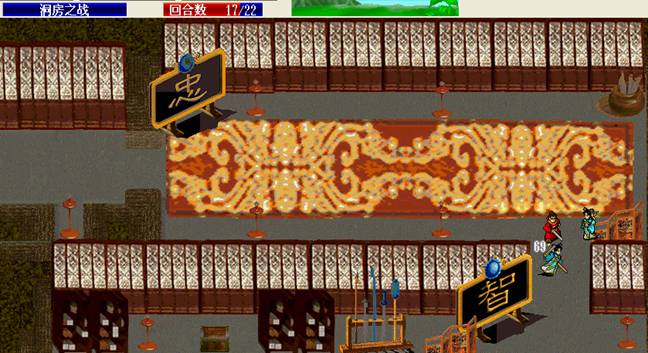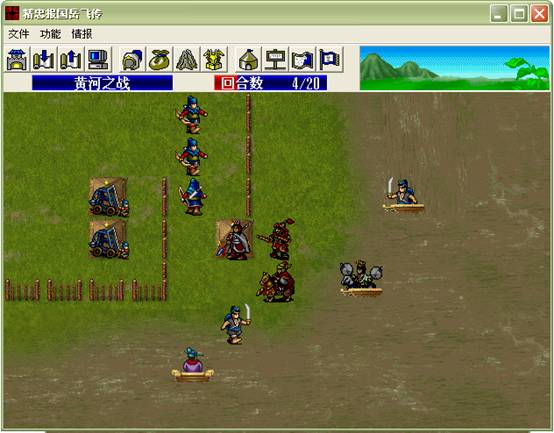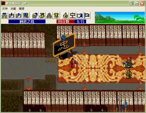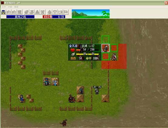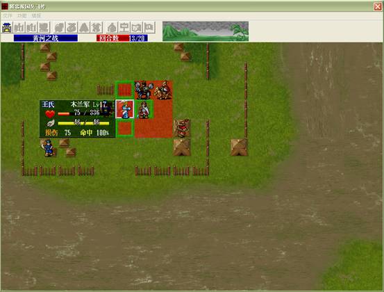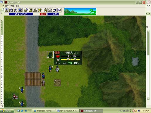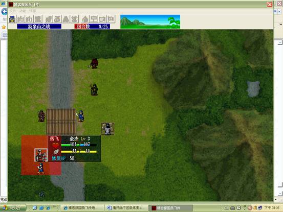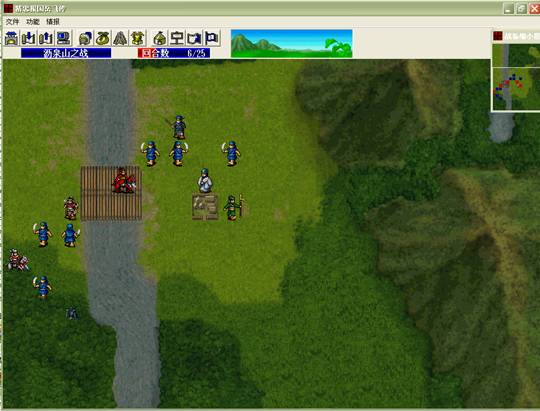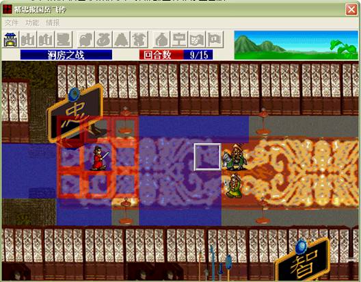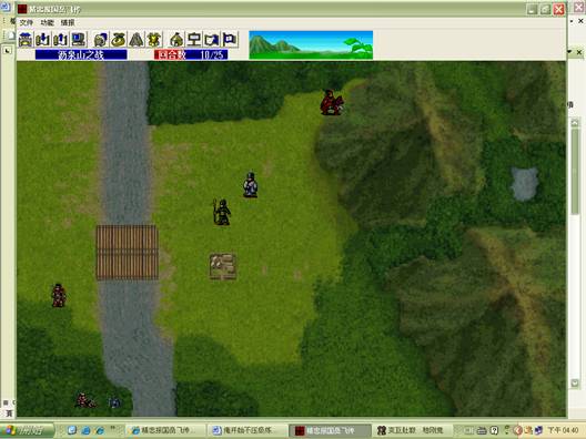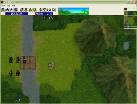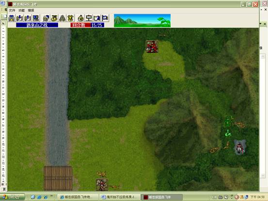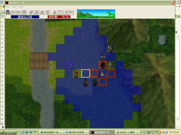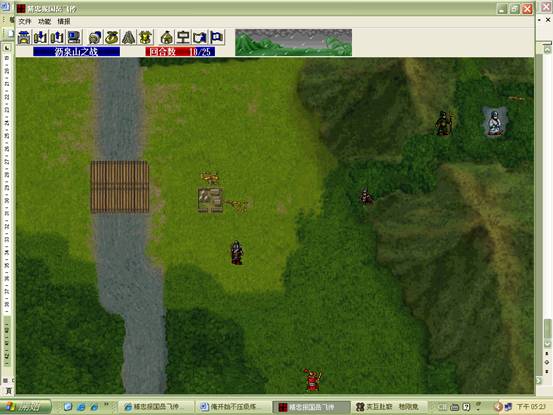 很多人都说第三回合才把伏兵引来,可是我不同意,因为这样 = -1回合所以第二回合马上引出他们,吉青组由岳王挡住,其它人马上过桥(图1)