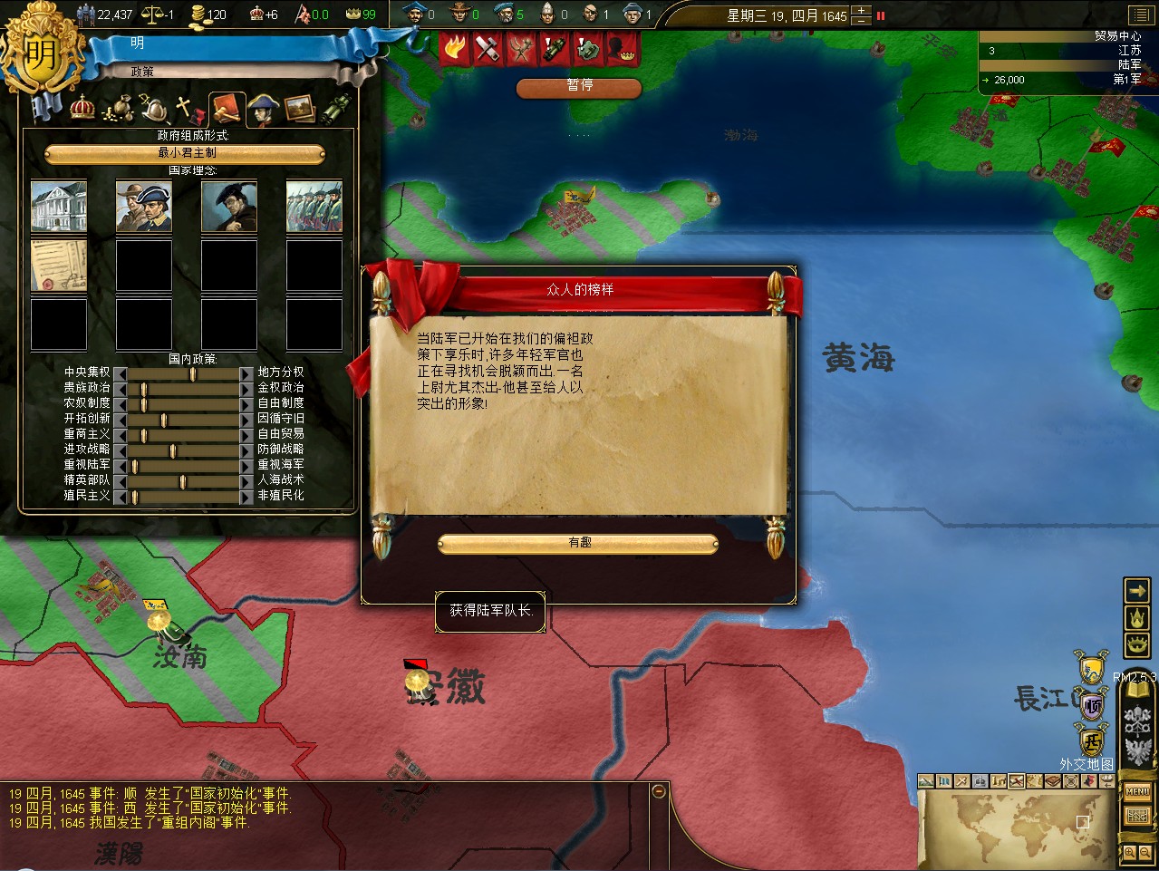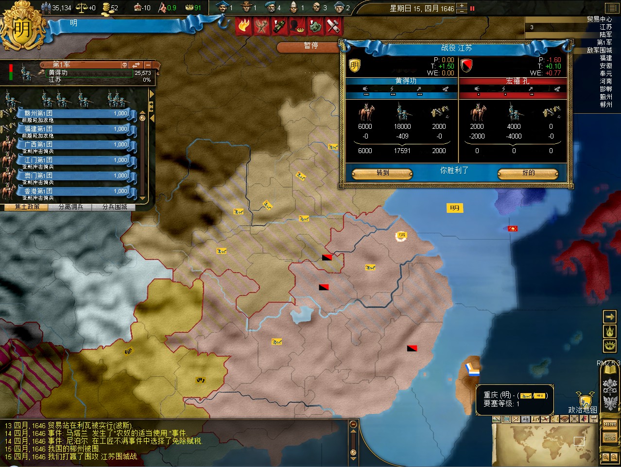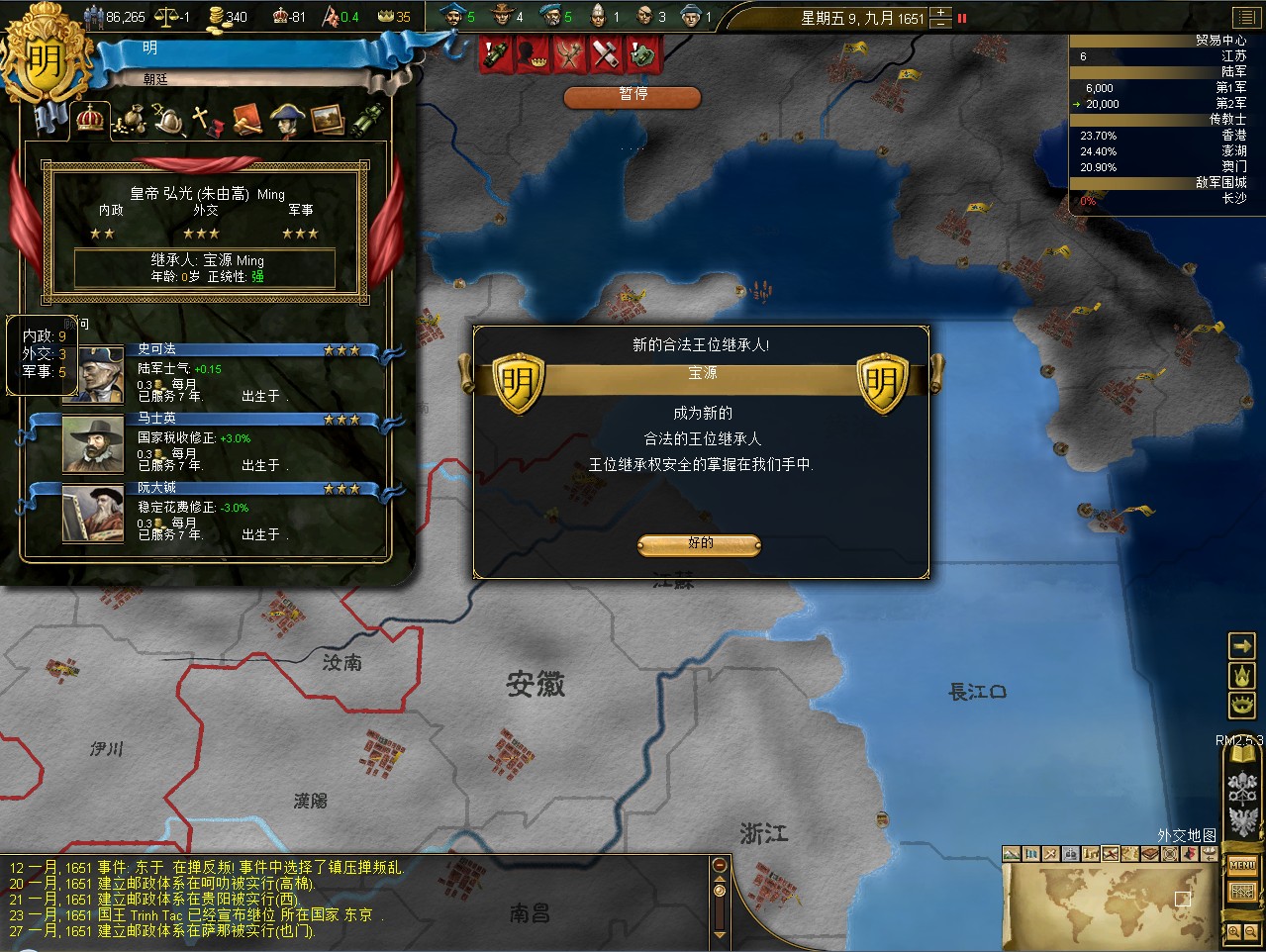 常例开局。话说三个南明剧本 1645 1652 1659,都相当BT。尤其是1659剧本,基本是不可能的任务嘛。1645剧本和1652剧本比较,1652剧本把张献忠的地吞了,兵略多些,还有个BT的李定国,但是1652剧本的南明有两个致命的弱点。一是东面被建奴占了一大片领土,这让我军无法迅速的以最小的代价来与建奴议和。二是江苏丢了,没有了江苏,经济上此消彼长,相当头痛。