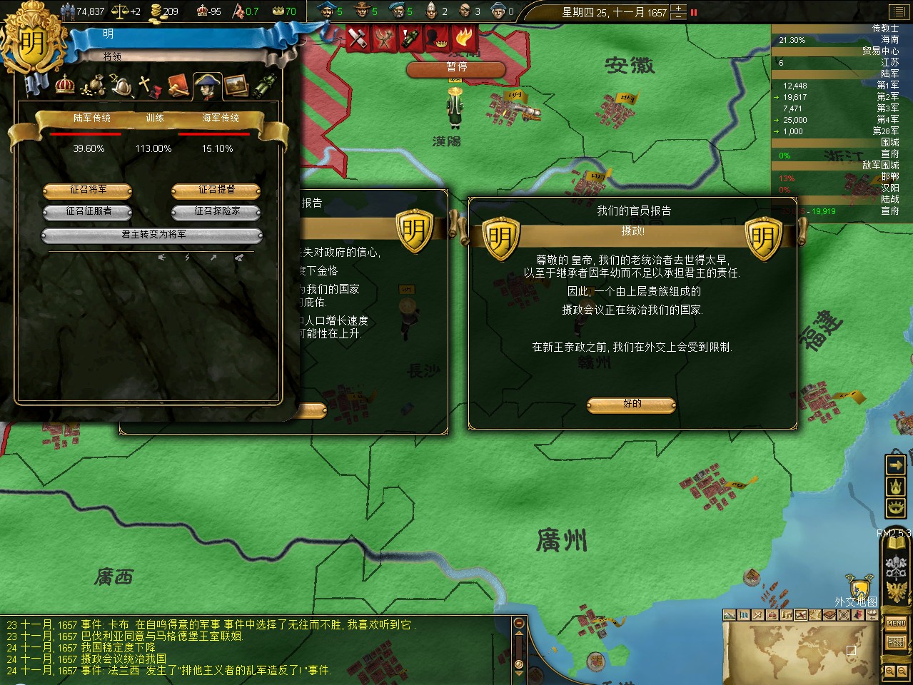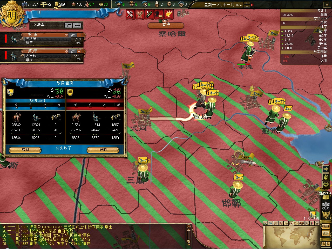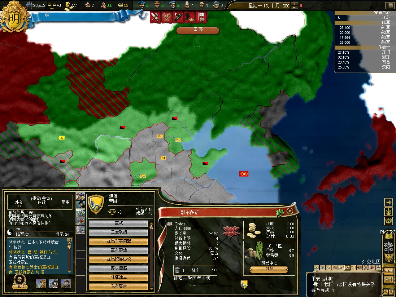 汇报进度。明代中国全境收复,建奴全灭,逆推尼德兰。现有领土:明代中国,满洲,朝鲜(对马(日占),郁陵(朝占)除外),越北,尼德兰旧领2处(包括一个贸易中心),夏威夷,非洲与南太平洋殖民地数块。时间1720年。明日补战报。