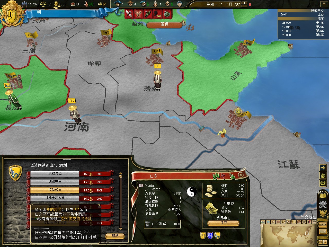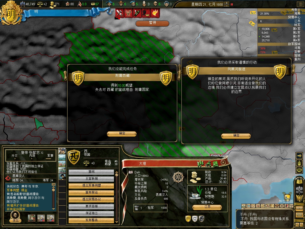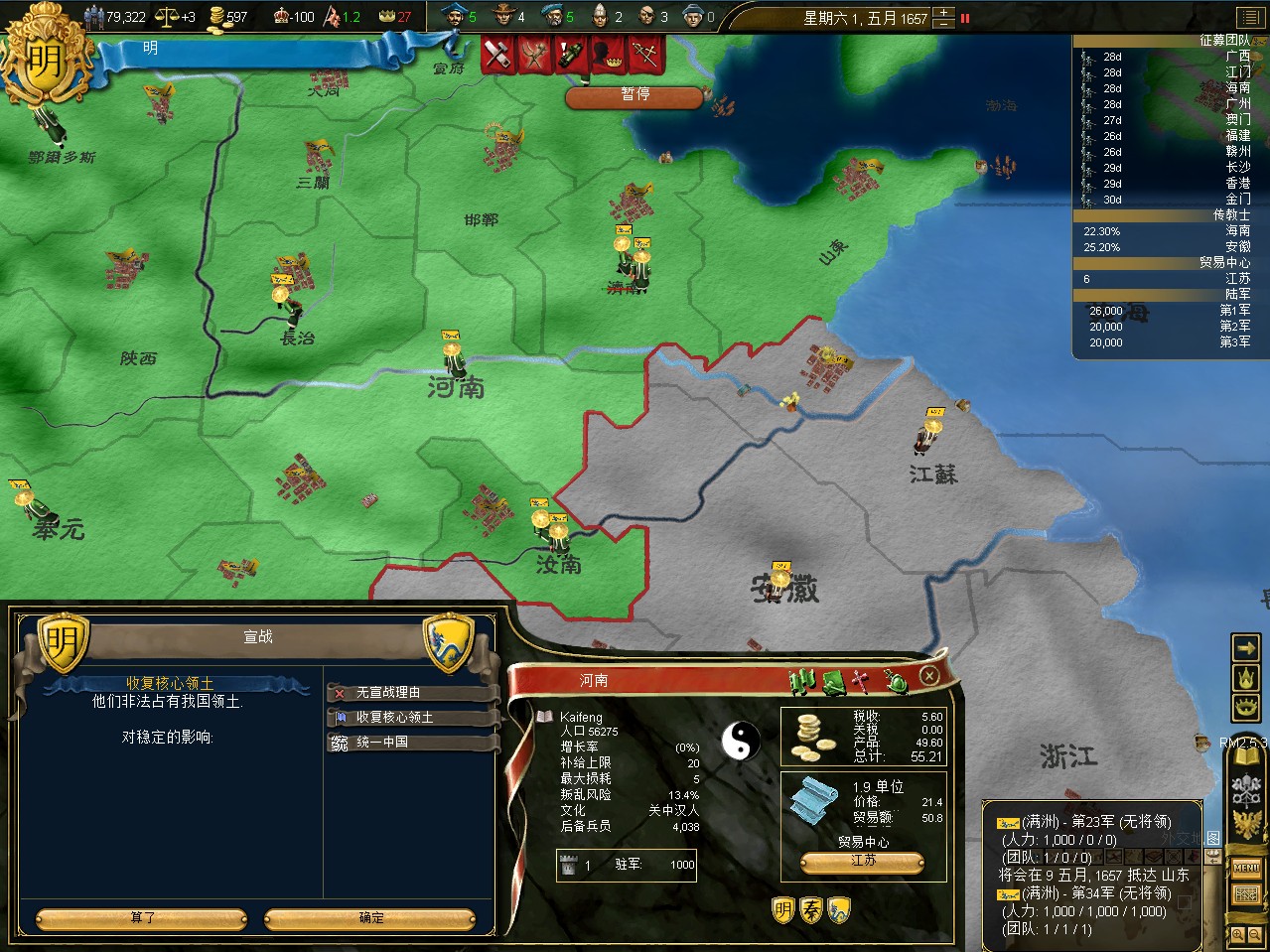 汇报进度。明代中国全境收复,建奴全灭,逆推尼德兰。现有领土:明代中国,满洲,朝鲜(对马(日占),郁陵(朝占)除外),越北,尼德兰旧领2处(包括一个贸易中心),夏威夷,非洲与南太平洋殖民地数块。时间1720年。明日补战报。