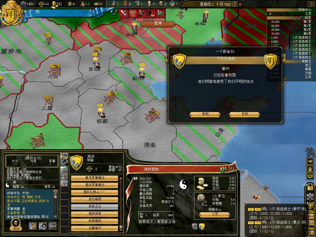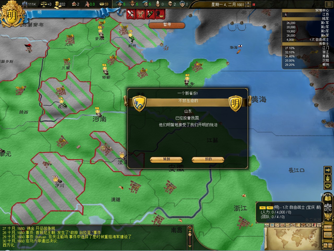 山东人民自发的组织了抵抗军,驱除了建奴官员,宣布加入我国治下。