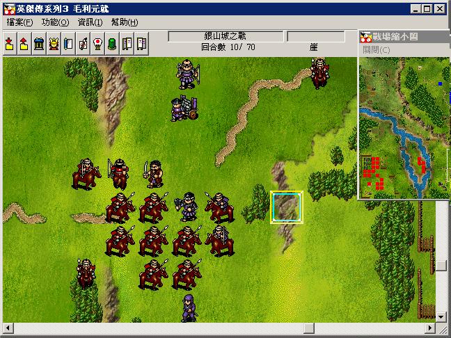 2:开局其他人向下,6回合的时候到达山口.第7回合,第8回合,继续向下,其中世鬼要连用两次快步,堵住敌军向城内进军的路线.到16回合左右第一批敌军全部消灭,并引出左上的敌援军.然后福原独自向左上行走对付敌援军(重要,如福原把他们引下来,暂时经验会多些,但是运输道具的路线会被堵塞,恢复酒会不够,也不能保证福原能攻击到最后一回合),其他人进军中间的小岛,岛上上方鹿砦的弓兵留着,让口羽反击到结束.剩余的人直奔敌主营.