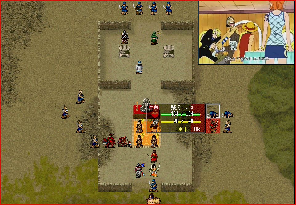 第一回合,施全加士气,余华龙双击+1暴击 牛皋暴击打无名拳师,哈哈,正好剩1血,友军回合,关胜杀之。