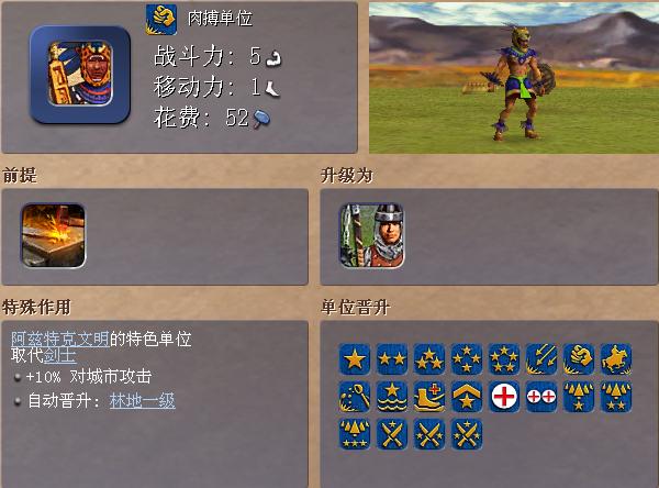 而阿兹特克的UU,乍一看也很一般,作为替代剑士的单位,力量还减了1,但是需要注意的是这个UU是不需要任何资源的!哪怕你方圆三百里内三无,照样可以出。再加上他自动晋升一级丛林,再加上兵营的1级,出来就是2级丛林,只需要5点经验就可以在丛林中如若无人之境!虽然攻城比较渣,但咱是种田一族,从来都是拒绝战争的