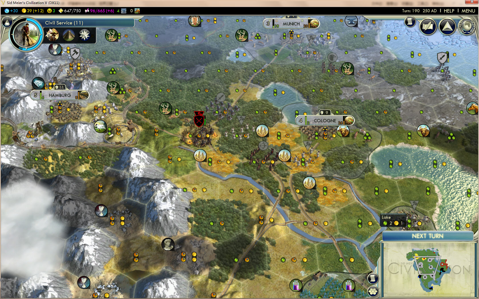 似乎汉堡的危险解除了,于是给汉堡再买了有绵羊的那块地,同时城里建造磨坊,不然没食物,人口还是不能增长。