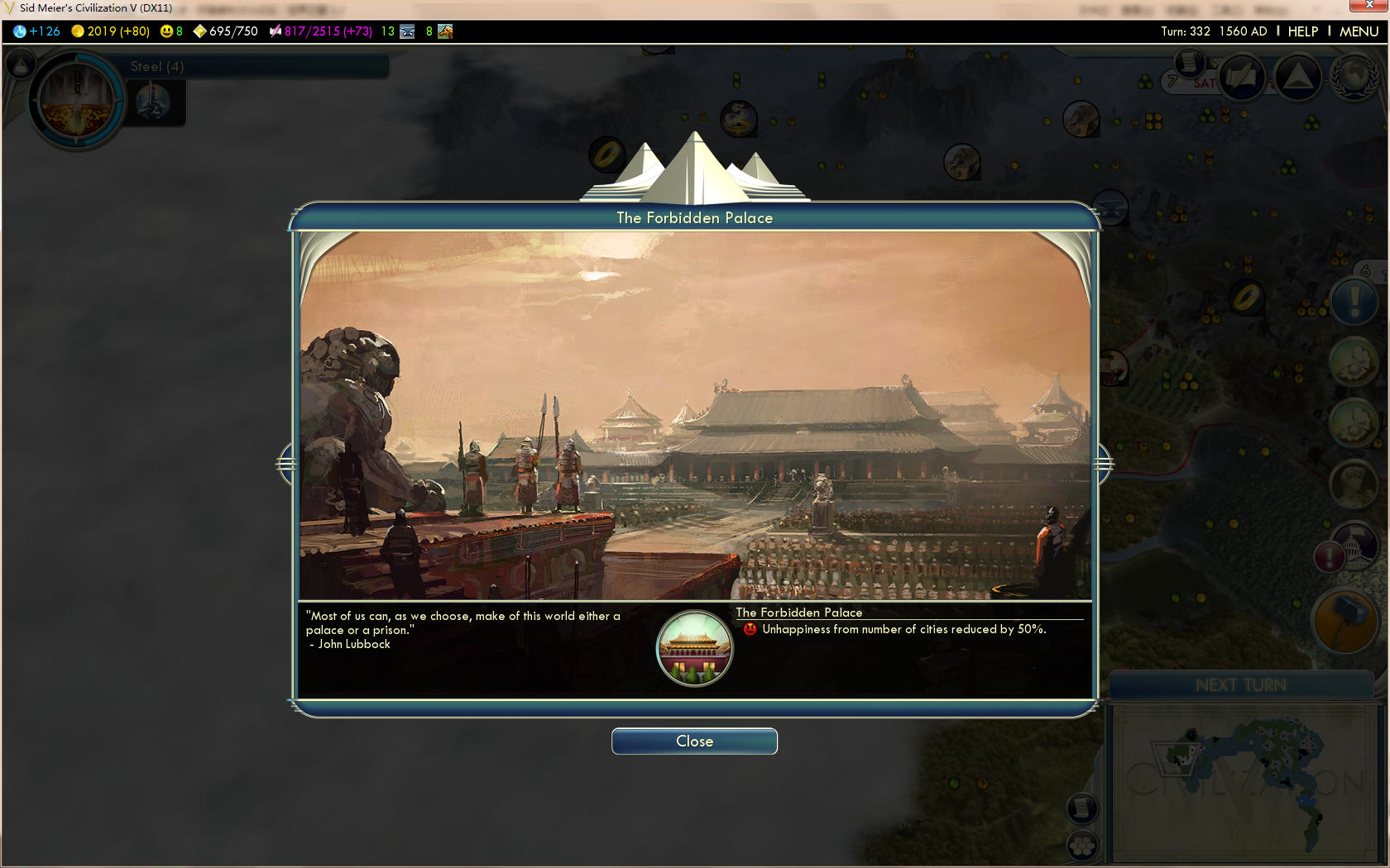 紫禁城已经建成了!铺城造成的不快可以减少33%。维持大帝国必须的啊。