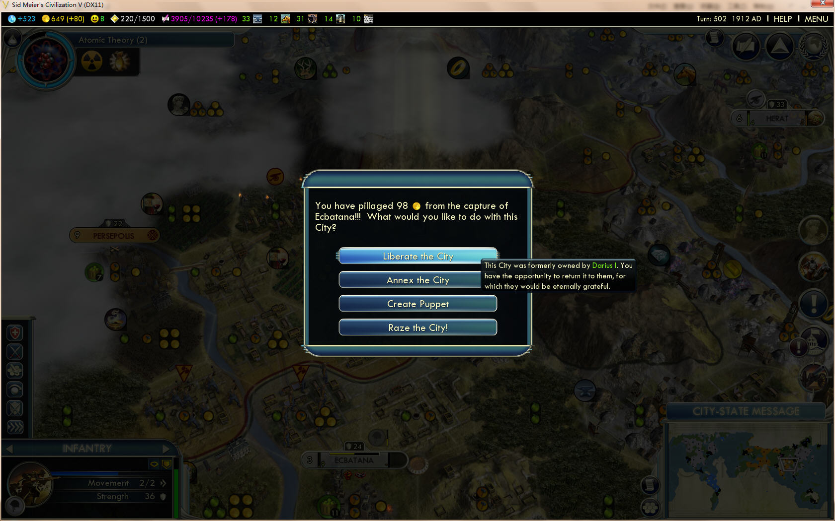 南线攻破了原波斯的首都埃克巴坦那。收了怕影响快乐,烧了又可惜。这一代可以存亡继绝,帮大流士复国吧。
