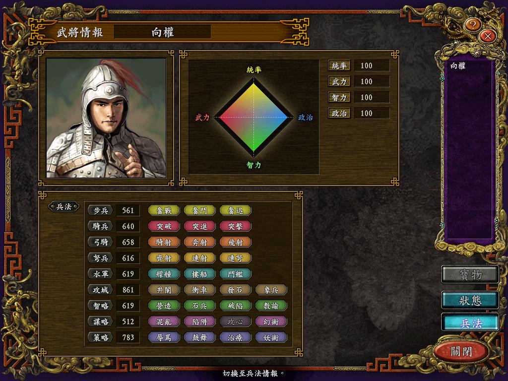 刚发现的小兵,用16进制编辑器修改其中的一处数据,在下一旬就能看到他的初始能力以及本身所掌握的兵法: