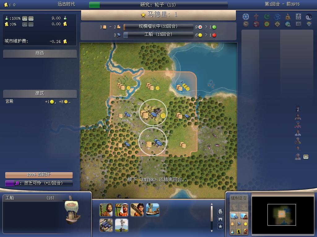 左移一格建城,这城还是相当不错的,1猪2蛤蜊2糖而且以后发现还有一铁,靠海也靠河,只有3格是海滨,应该还是不错的吧?