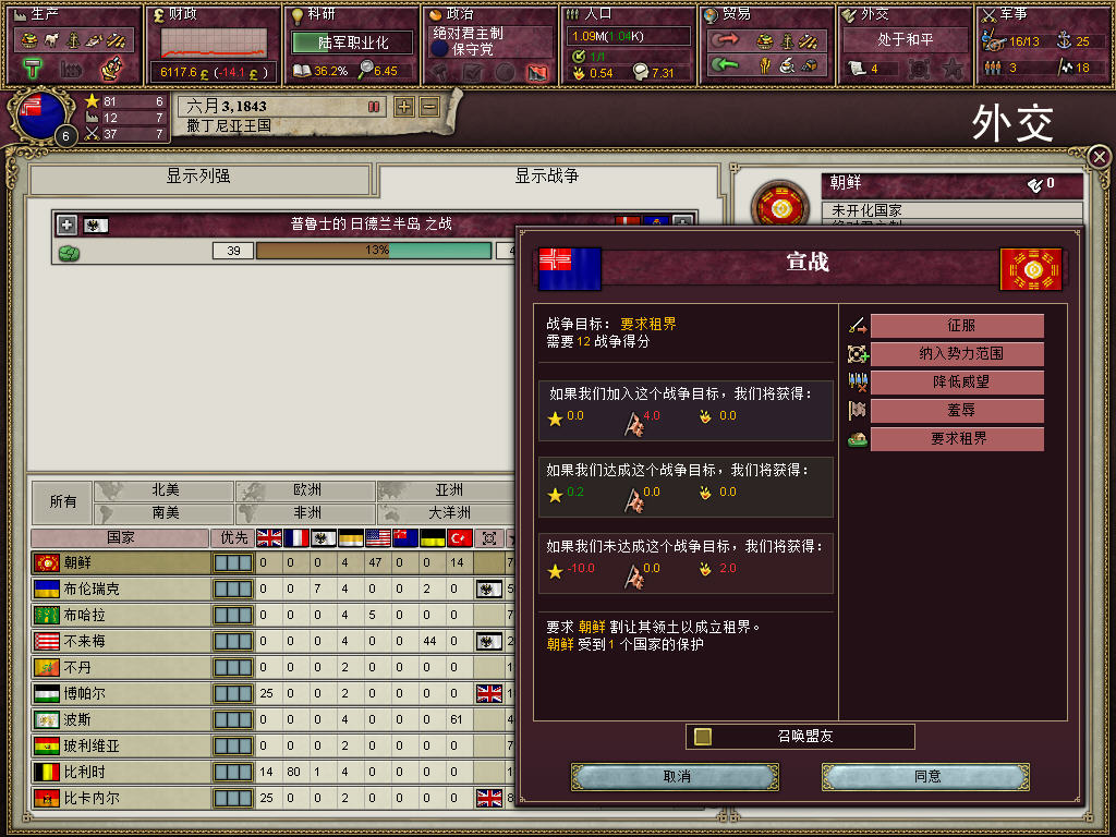 难度选的正常,版本1.2汉化版,未使用任何MOD,VIC2好像没有侵略度的选择,反正我是没有找到。