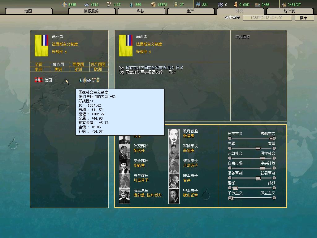 言归正传,傀儡国没法玩,所以开局先进日本放弃了对满洲国的傀儡权,然后进满洲国开玩,设置如下: