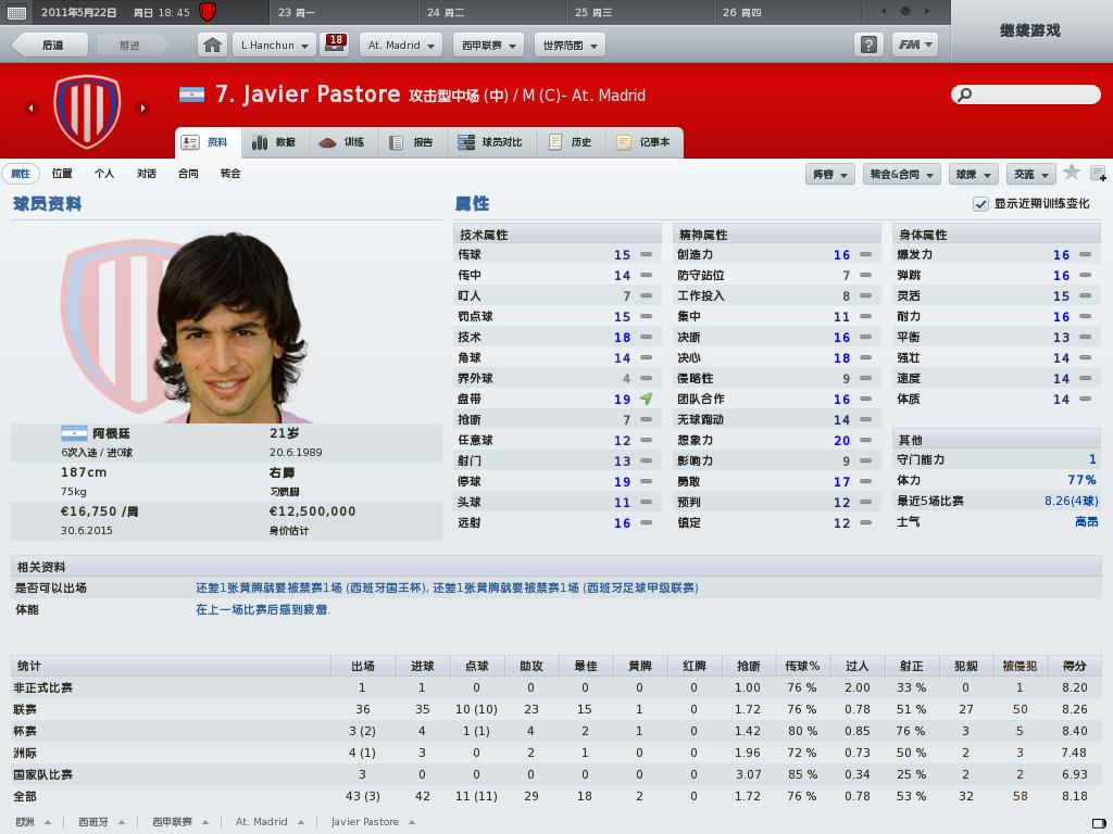 最近用了一次马竞,开档后基本上没有动马竞的原班人马,但是因为不太喜欢Reyes,所以从巴勒莫引进了Pastore,当作主力AMC重点培养,没想到Pastore居然给力过分了,43场比赛进了42个球,29个助攻,是联赛的进球和助攻双料冠军。而神级的Aguero也才34场比赛进了23球加23助攻。一个正印前锋居然还没有一个AMC进球多。可是就是这样的华丽丽数据,西甲最佳的头衔居然还是被C罗给强取豪夺了,真是黑幕啊。。