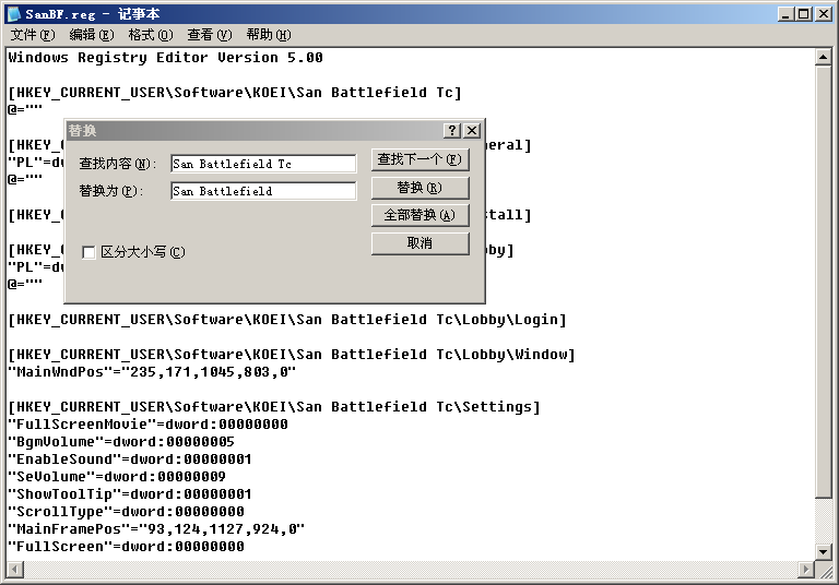 然后使用记事本来编辑,使用查找替换功能,将全部的San Battlefield Tc替换成San Battlefield,然后保存文件。