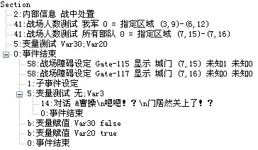 但是事件需要测试条件,需要给一些变量来完成约束。比如武将相邻后的对话,(只发生一次),就需要一个变量来表示是否相邻过。反正就是需要增加一些变量,但又害怕和以前的变量冲突。如果和别的剧本中的全局变量命名冲突,就可能会造成死循环等不良后果。