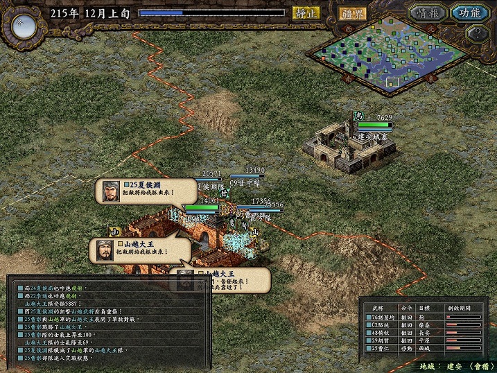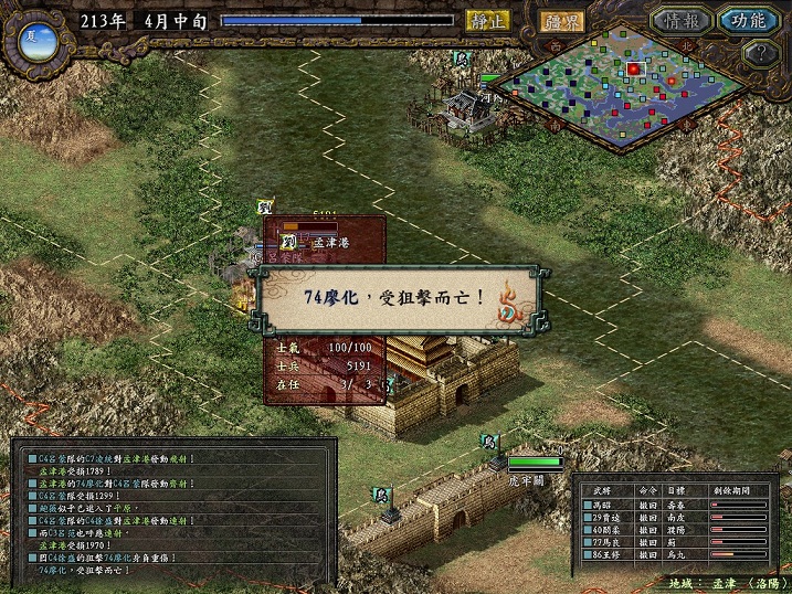 动辄一个长蛇过来,我还没来得及反应就把孟津攻克。但随即洛阳守将吕蒙徐盛等人组混乱弩兵队出击,又把电脑围在港口里打,这一次徐盛狙击,廖化毙命。随后我撤军,电脑再占,再围港。往复几次,刘备军损兵折将,什么关平刘封等辈在这里被擒了无数次。只是因为我也不愿守港口,只得一次次把他们都放了,赚点信望了事。这里也看出AI是死的,人脑是活的,只要想玩弄电脑总是有办法。
