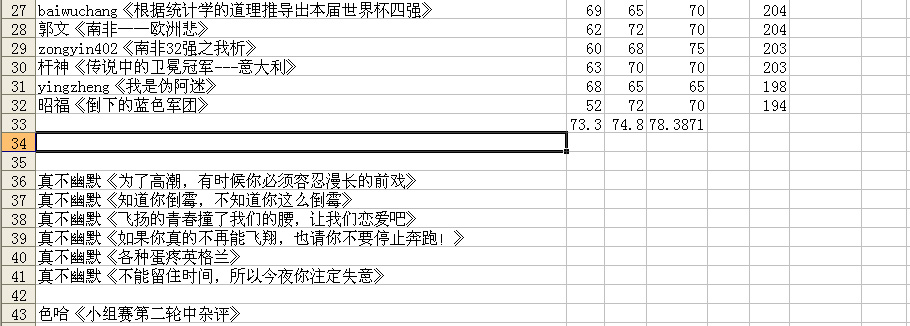 这次评审,由体坛的超版冰祁步以及体坛两位版主(我和啊哈)三人共同完成,其中真不幽默7篇作品因篇幅较短,风格一致,被合为一篇,取其最高分篇得分+6为准,啊哈版主同,两篇作品合为一篇。于是38篇征文,审评结果如下(见图):