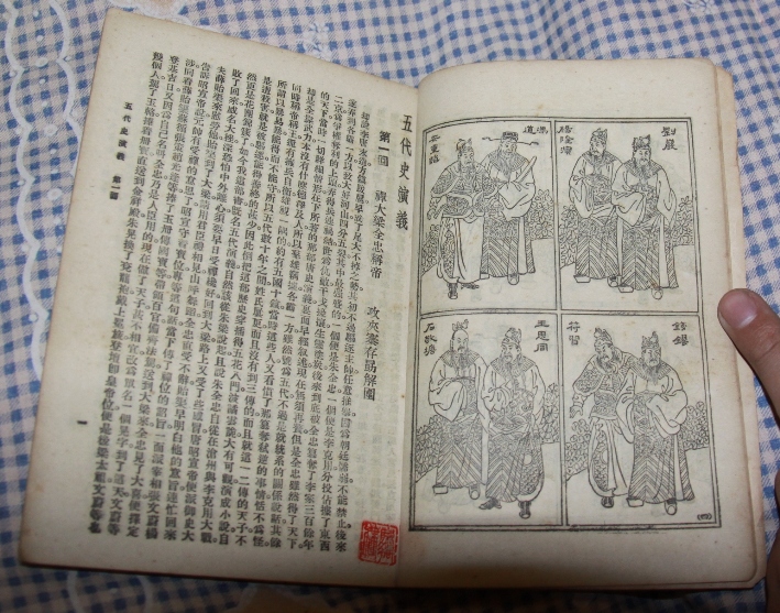 这本民国小说,掀开封皮仔细看看,这是本线装书。书的背面印有“四等赏”三个字,我怀疑是不是民国时期这本小说作为学校的奖赏送给学生的,另外就是是不是沦陷区的学校奖给学生的,因为日本人习惯用“赏”,按我们习惯应该是“奖”,而最大的猜疑则是对小说真伪的判断,因为这本书封皮保存还是挺好的,但封皮不是线装的,是糊在线装书上的,虽然糊的很好,但我还是看出来了,幸好在书封底著有:“安重诲献计灭唐宋”的字样,从文字内容和封面内容相对比还有点相像,更重要的是“绣像仿宋完整本”、“广益书局刊行”等字样和内页的有关内容完全一致,通过推断应该是一本真正的民国《五代史演义》。