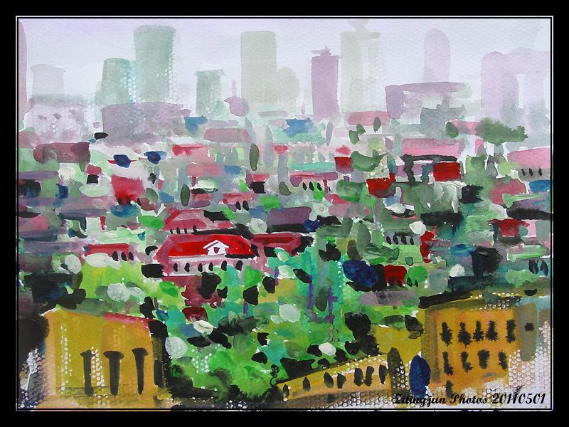 今日,闲坐无聊,窥见一旁用剩的水粉,趁还没干,就着阳台上所见,随手绘就,笔法杂乱,用色花哨,回想上次如此作业,已十年矣。如斯: