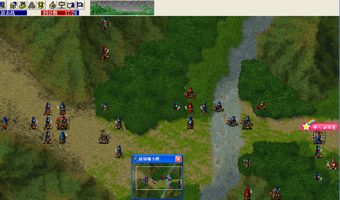 既然发成功就讲解一下吧。第四回合引出伏兵,曹操辅助骑兵布阵三回合,第九回合就快要过越过下面的小河了,然后直奔李儒而去。下面的曹洪在山地上吸引一个弓骑。曹操在如图的位置大约可以挨砍2-3回合,其间最好都是雨天,晴天的话要多耗个豆;18回合左移一格吸引吕布攻击同时补豆,19回合双击李儒,不过这个回合他还会吸引一个骑兵的攻击,20回合应该就能击退李儒了。