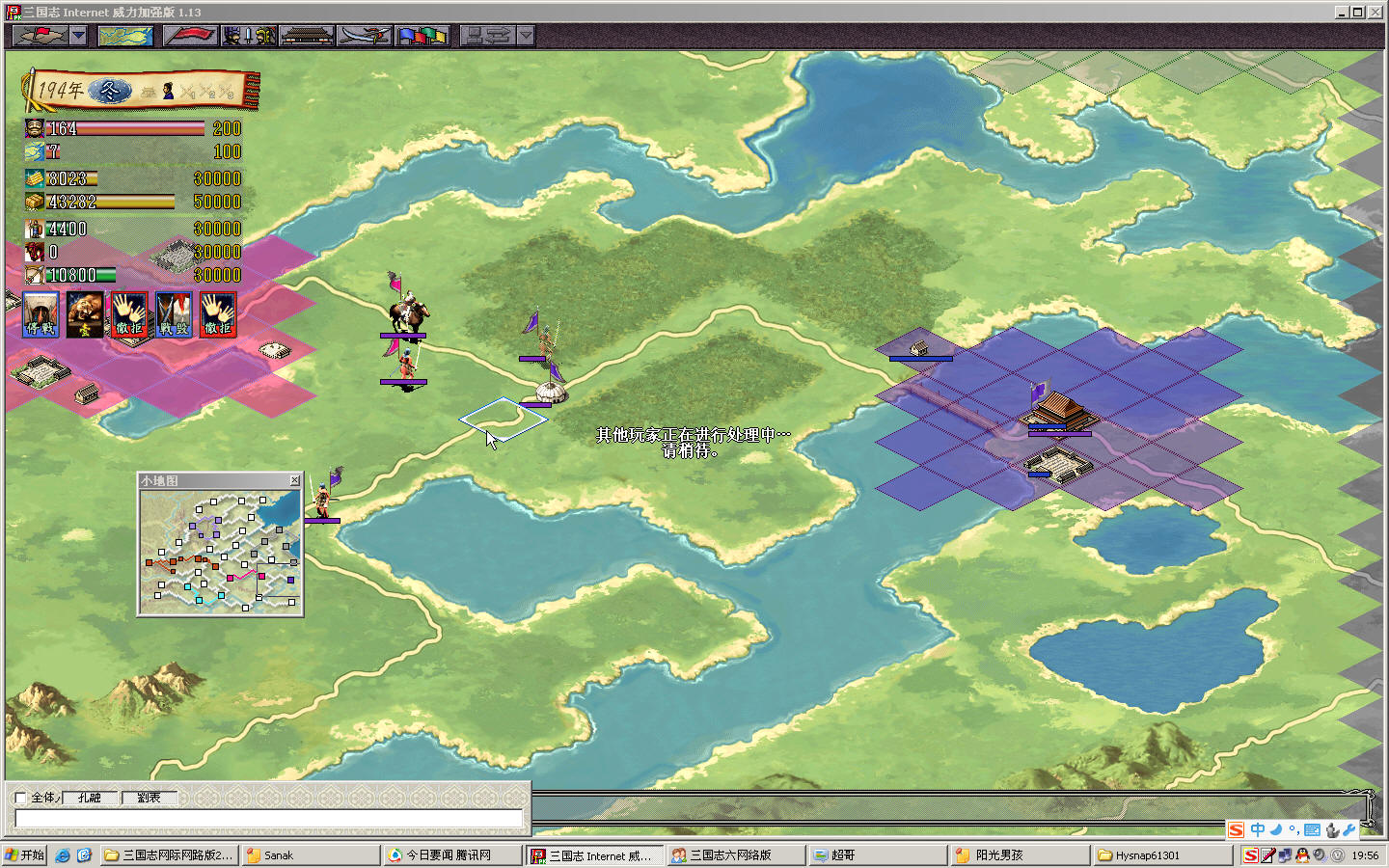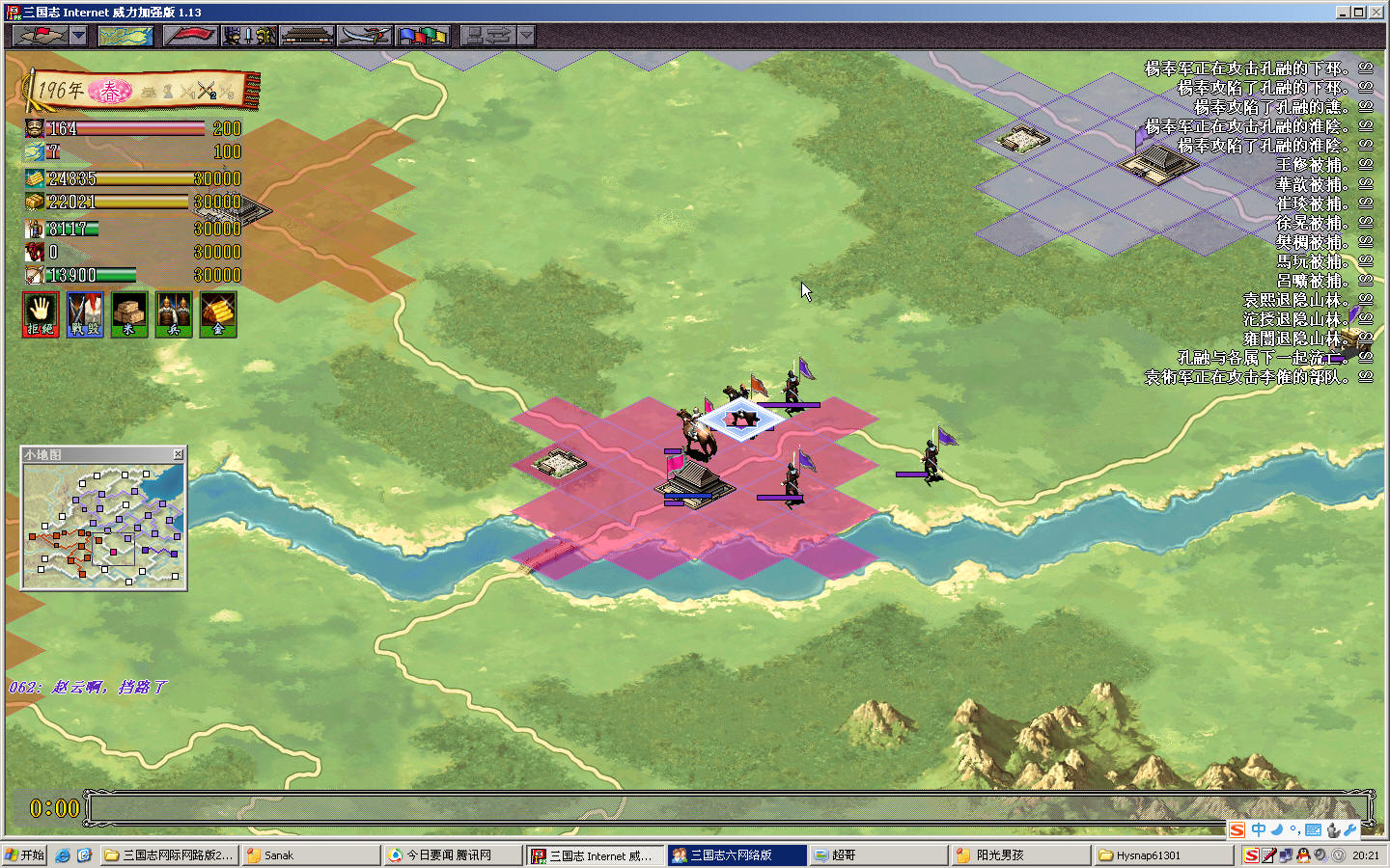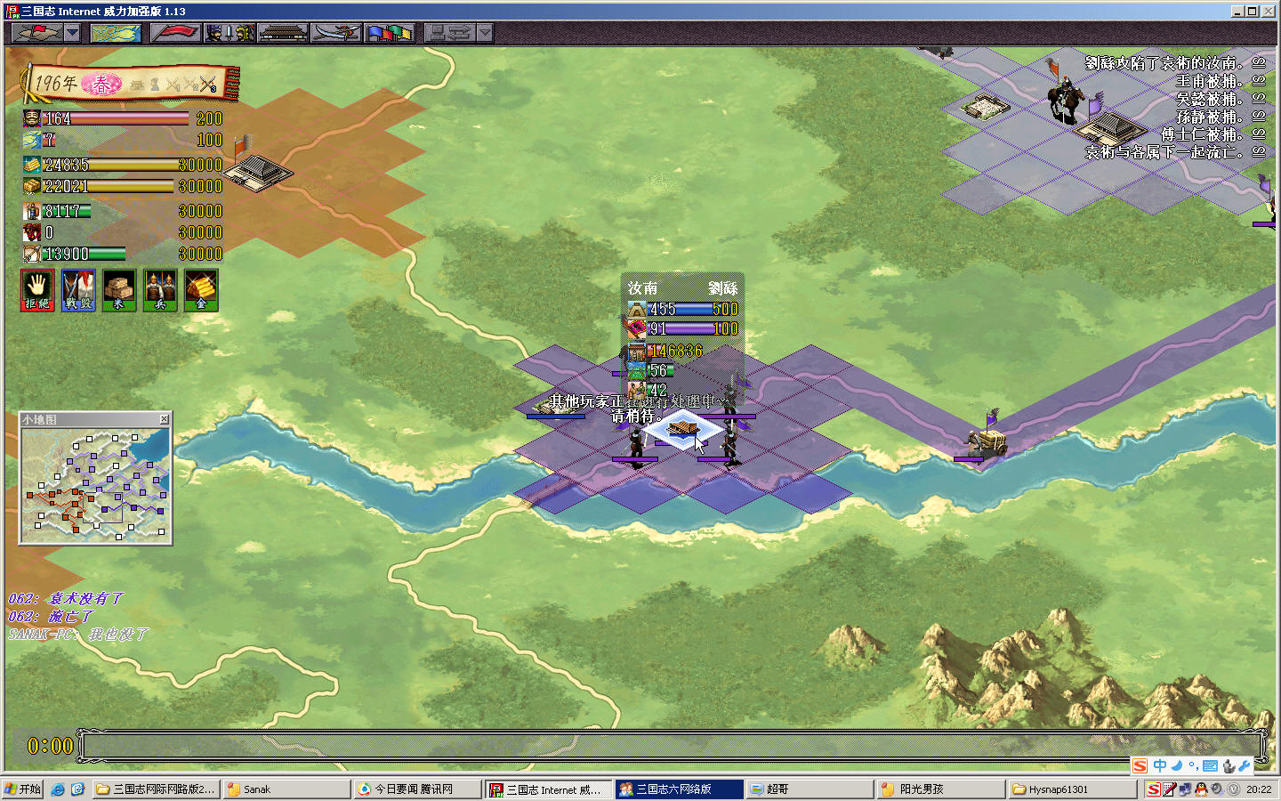 君主和武将全部是随机,结果我很郁闷,分到个刘繇,武将一堆垃圾,只有关羽一个强人,两万垃圾步兵和两万垃圾弓兵,同名则有刘表和孔融。