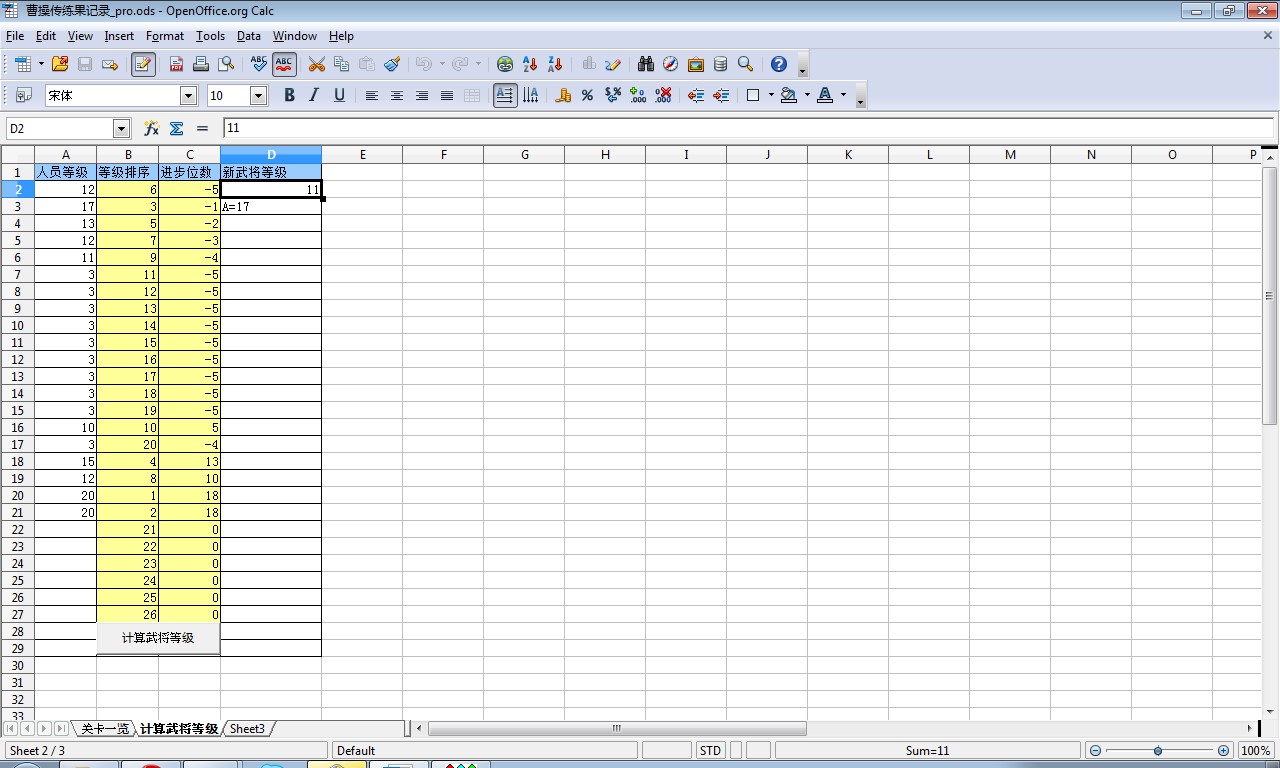后来又增加了一个功能,在第二页可以计算新加入武将的等级,需要用到宏命令,要在Excel的 工具->选项->安全->宏安全中将安全等级调到中级,然后按默认排序输入己方人员等级,就能算出新加入武将的等级。PS. 这算法是我自己写的,如果计算有误,还望告知,我好修正。