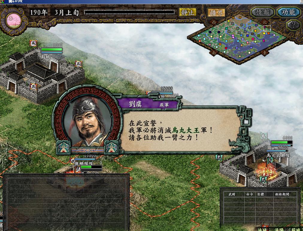 190年2月中旬,我军完成了进攻乌丸钱的兵力布局,刘虞亲自率中军6万1千人驻扎渔阳,鲜于银等四名骑兵将领带领5万2千骑兵驻守易京。2月下旬,我军正式向乌丸宣战,打响了攻略乌丸的第一枪。为此我以田豫、单经、刘虞率领三队井栏队进攻乌丸,中继点设在鲜城,邹靖带队1万方圆阵5天后出发迎战对方攻打井栏队的部队,另外齐周、鲜于银、鲜于辅、焦触各自带一队骑兵包抄乌丸出城部队,力图野战剿灭对方,为我军接下来井栏队攻城消耗对方兵力。对方果然派出乌丸大王和乌丸武将两队试图攻击我井栏队,正好被我围歼。战斗中乌丸的单挑给我放造成了很多麻烦,其乌丸城发起的连弩也给我军造成很多伤亡。但兵力的优势还是让我军迅速取得了野战的胜利,先后歼灭了对方的乌丸大王队和乌丸武将队。野战的胜利也使得我井栏三队顺利在乌丸城下回合。4月中旬,我军攻克乌丸!