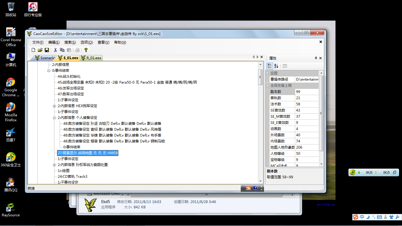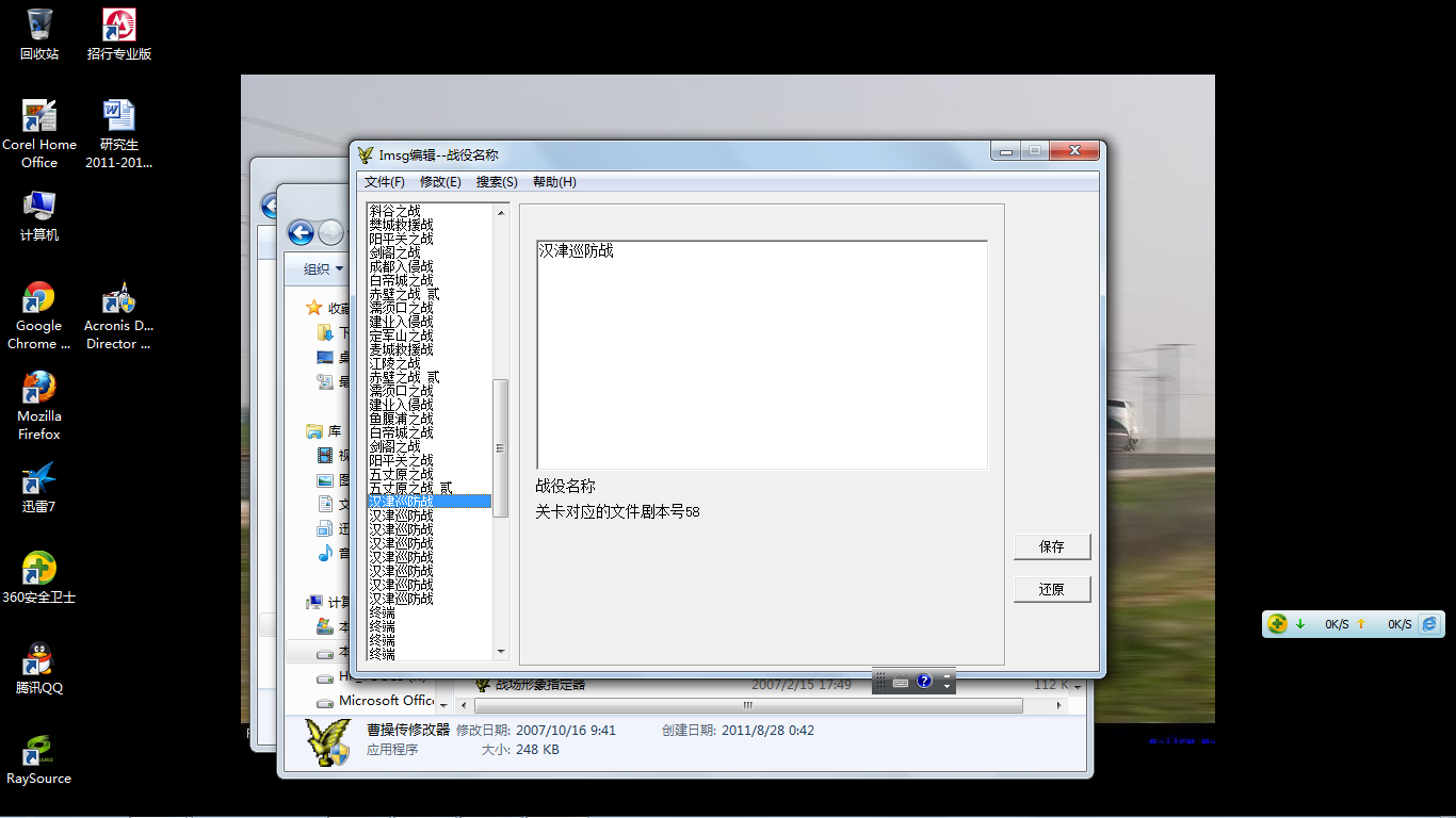 随后,我用叶落秋寒的曹操传修改器,修改IMSG文件中的战役名称,修改第59关为“汉津巡防战”,并保存。
