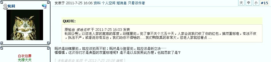 C会员(我懒得粘贴完整ID)对潜行者ID很久以前对前任总理的负面评价进行举报,但是在举报贴中明显是对执政党进行调侃,从法理上和事实上,都是C的过错要大于被举报ID,但是结果是被举报的受罚,而C连警告都没有。类似的还有不少。请TOP和恨地平心静气地反思,在处理左和右犯错的问题上有没有尺度上的不一样。C的挖坟动机和影响到底如何,以及类似投诉,我想也应该考量。
