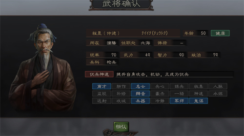 盧植很多特技, 內政人事都可以, 前期牛人, 就是不要花時間加四維, 真的活不了多久, 用來衝一下內政最好;