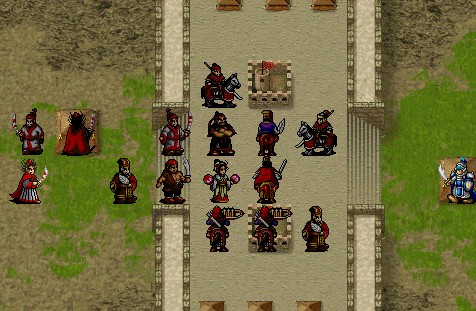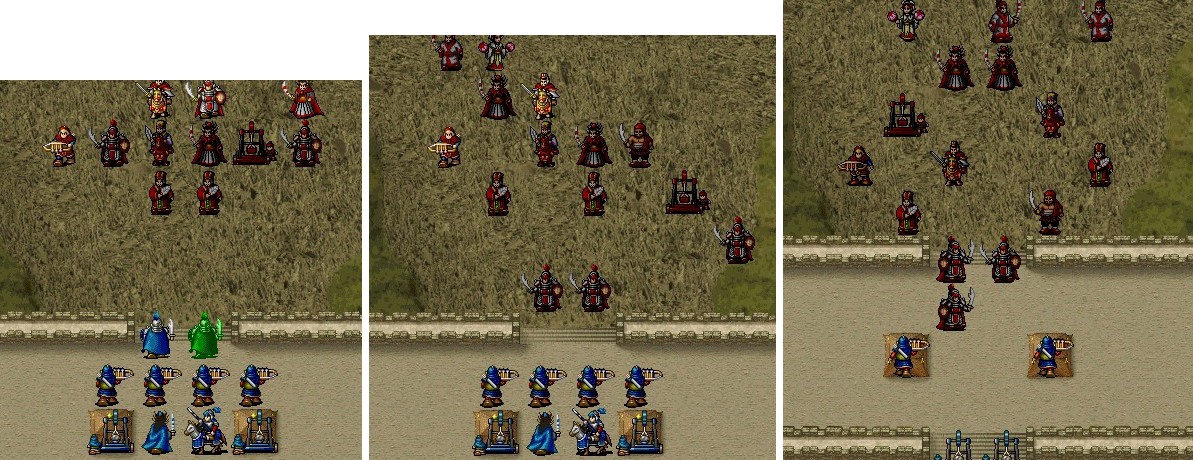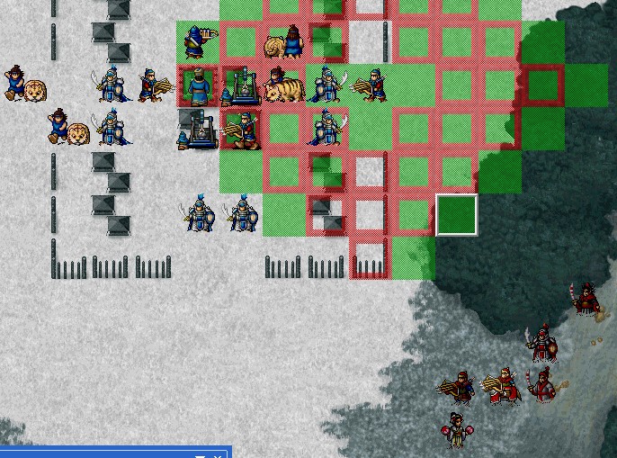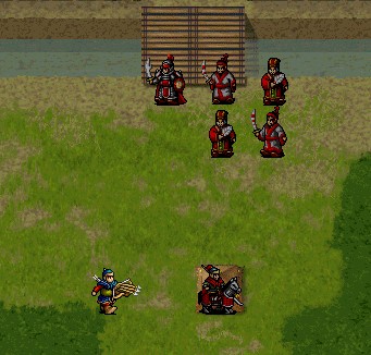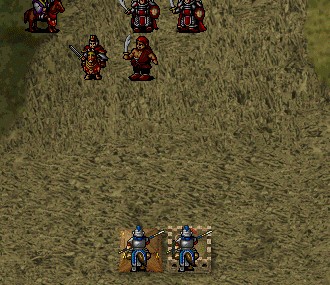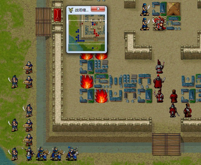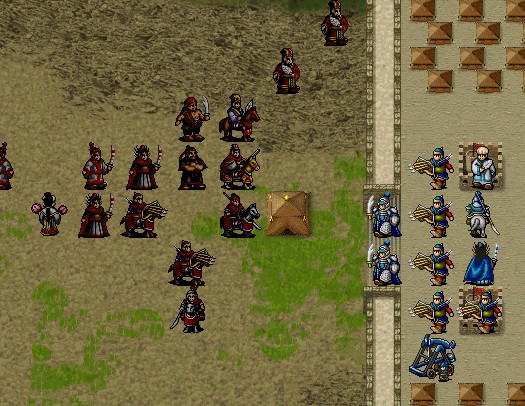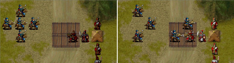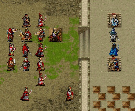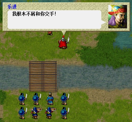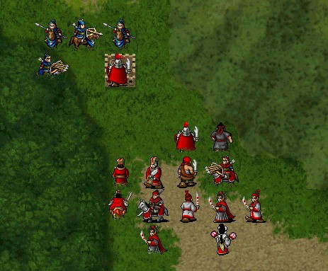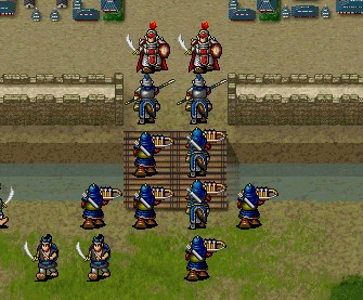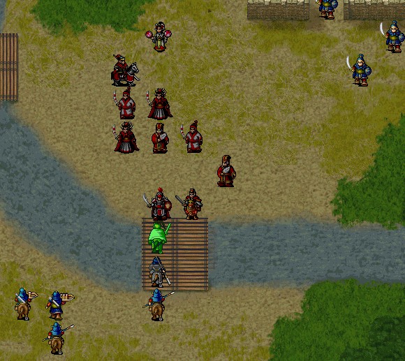 叫关羽上阵去挑颜良吧,这家伙有豆袋挺耐打的。我方专心对付左边桥头,如此站位勾引弓骑,在敌人的骑兵还没升到高级兵种时真是相当好用。后面曹操赶来巩固防线。