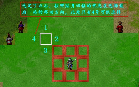 其实这种情况很早之前已经有过一个说法,就是周瑜在他的《敌人行动详解》一帖中提到的:“以敌人原位置为原点,上半平面优先,上方优先,高度相等时,右方优先;下半平面,左方优先。按照上右下左的顺序走向该攻击点。”不过实际情况跟此说法有不小的出入,远不是这么简单就能解释的。比如下图这种优先度,就无法用该说法解释。