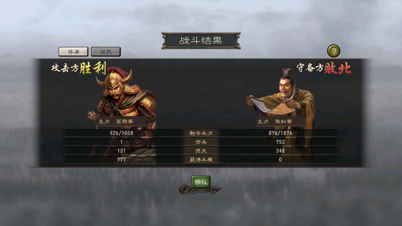 战斗结果:完胜,剩下847兵,时间不到100秒,如果不用最快的话时间能多点。