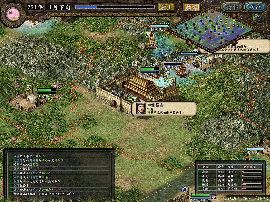 觊觎猪哥的宝物很久了,但这家伙不是头领,不能换,而且统帅高不好抢。有一个回合本来局面不好,正要LOAD,忽然发现猪哥被尚香MM打残,他是太守,旁边的颖川阵里正好有我的一帮人,于是机会来了。本来军师不推荐胃炎,但我看他武力最高,就还是让他去了。。。。。。哈哈