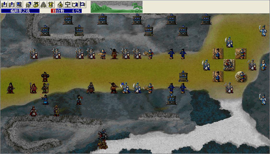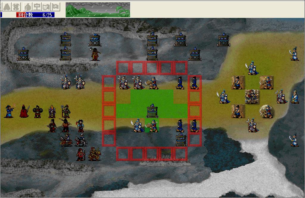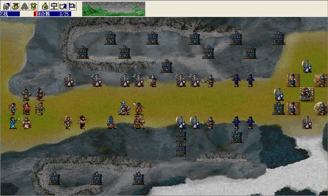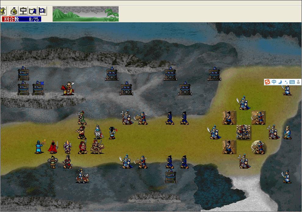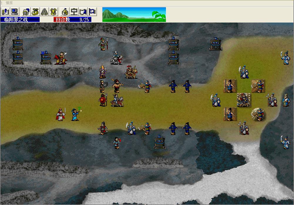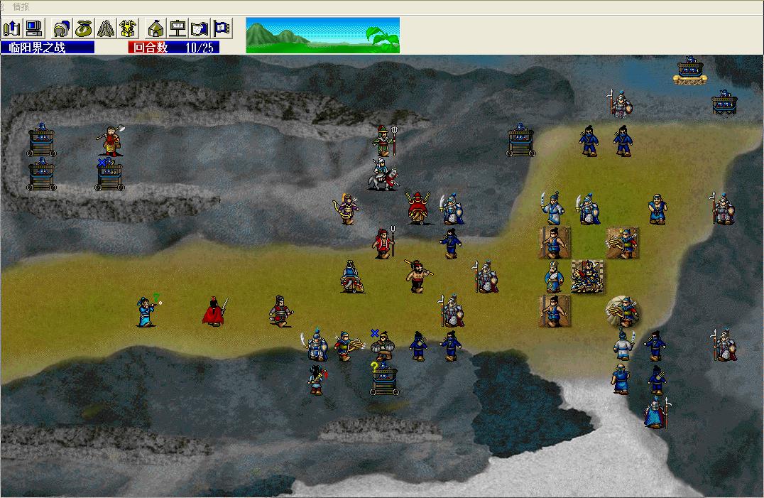 一开始在靠下边有两格宽的路上是两边箭车打不到的.从这里杀进到山口,再派下秦琼上