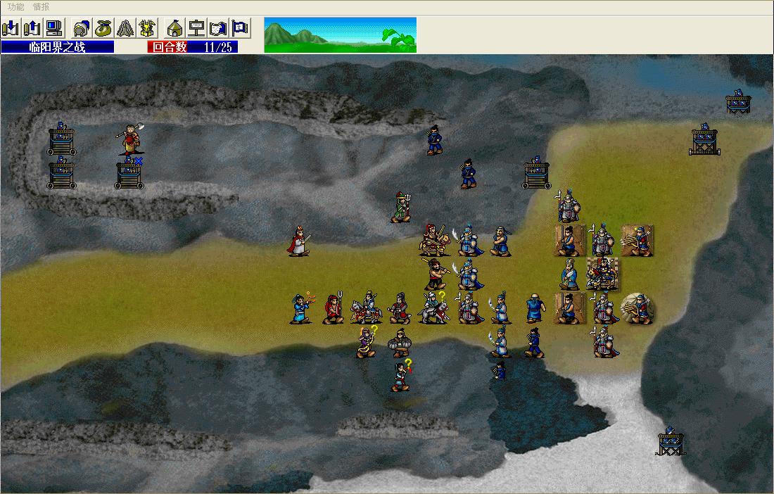 老程上山头杀箭车. 文官老齐弓箭手也可以帮忙打箭车,但要算准位置: 挨近两格处箭车打