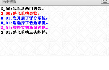 历史情报说明:黑色为岳银瓶培养相关信息。红色为S剧情重要信息。蓝色为R剧情重要信息。紫色为宝物获得信息。