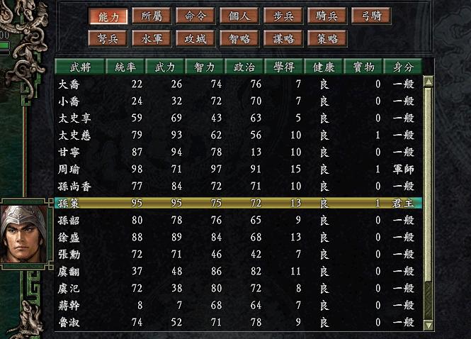 孙坚:扬州牧,拥4城,辽东公孙渊提前向江东称臣(反三国志),并搬家到了会稽,另宛城军张绣归顺了孙坚,所以吴军备足了北上的信心,人才(天下第三),称帝·国号大吴越。
