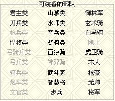 各位前辈 小弟我在修改MOD的过程中 遇到一个问题 就是 宝物 的可装备部队的显示问题 请问要怎么样处理 才能让宝物的可装备兵种 按自己的调整来呢?下面附图 白的是不可装备的兵种 黑的是可以装备的兵种 这需要怎么修改呢?