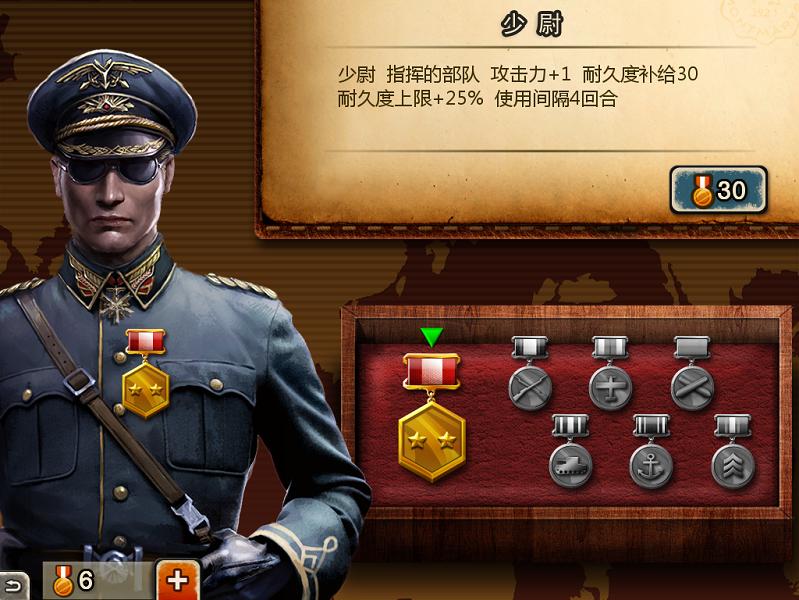 指挥官升为少尉,攻击力+1,耐久度补给30,耐久上限+25%,使用间隔4回合