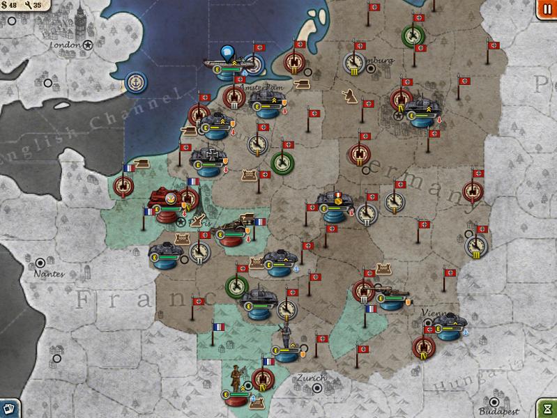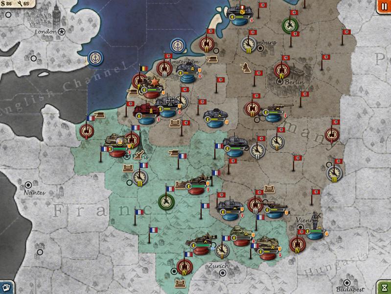 我军迂回作战的2个坦克师分兵,1个坦克师配合A集团军1个步兵师攻击退守南方的法军1个步兵师,1个坦克师配合我军指挥官坦克师歼灭法军巴黎外围的1个炮兵师