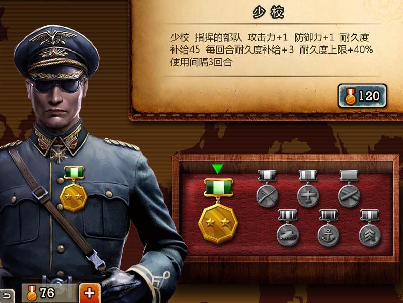 指挥官升为上尉,攻击力+1,防御力+1,耐久度补给40,每回合耐久度补给+2,耐久上限+35%,使用间隔3回合