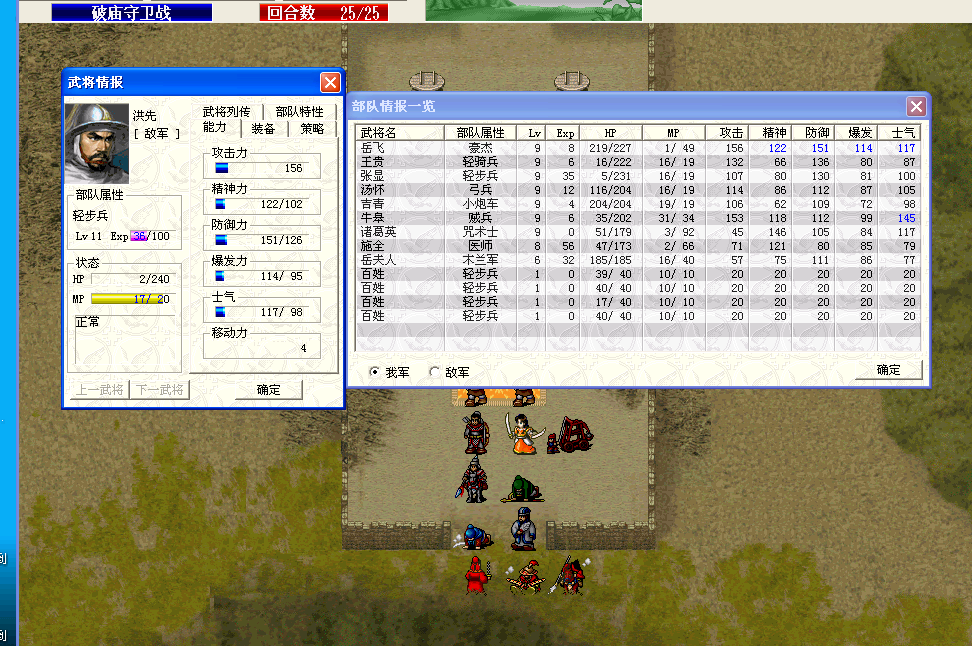 心得:1.按常规战法很难全员6级以上,故通过尽早引出牛皋,攻击牛皋引他反击,使牛皋能升到6级甚至7级,然后汤怀等人攻击牛皋才能获得更多经验值。
