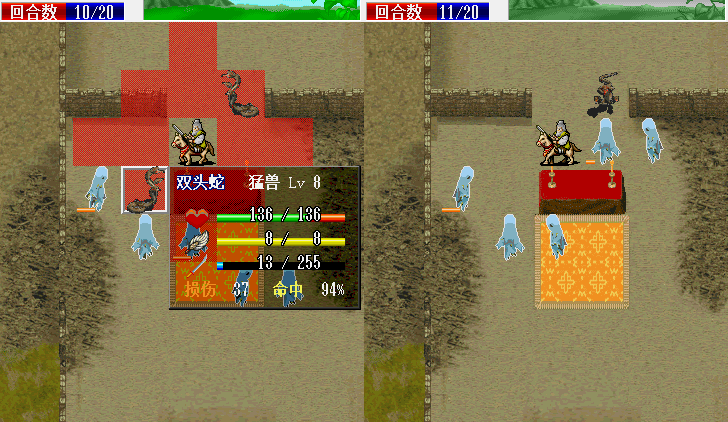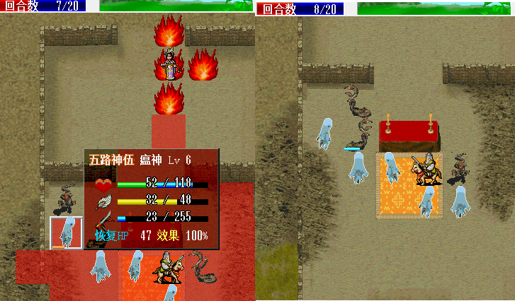石怪石矶到达中心岛,石矶会繞到哪吒的前方兩格攻击,哪吒反击不到石矶,李靖記住加血,哪吒代師傅火燒石矶