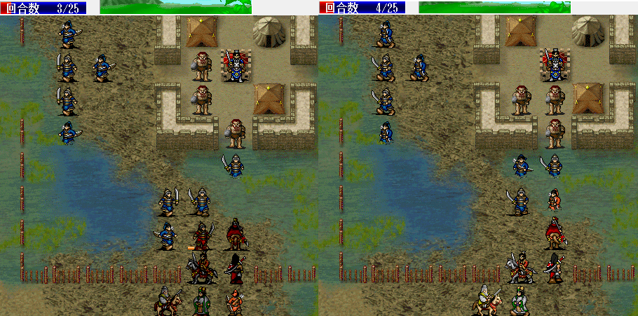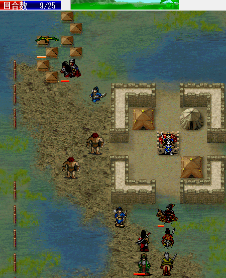 黄飞虎负责打兵营里的人,天禄斜角打弓骑,不够血吃住要吃米,不要省了,,麻烦的是要SL父子加防都不可以掉,本人飞虎防御20回合掉,天禄19回合掉,反正那时候敌人剩下不多了,没必要做多余的sl