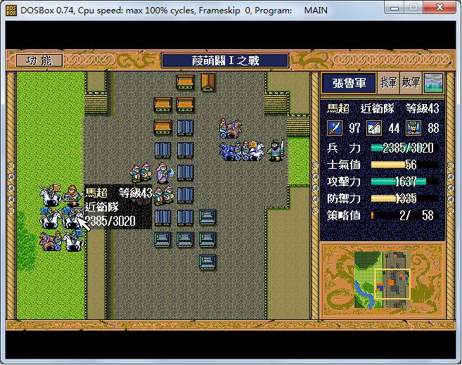 基于以上4点,本人采用的思路为,利用地形及敌方近卫队配合将马超包围,只留一个方向正对我军弓兵(简雍),而张飞等可躲在弓兵身后挑拨,军乐等亦可从容布阵。马超在无法动弹而选择攻击的对象又只有简雍(85级连弩)时,每回合只能乖乖地原地激励。在需要增补策略的回合,将简雍位置换老军乐糜竺(9X级,一次回复10策略值),同时在该回合将马超士气降至20以下(保证其不攻击)。考虑到本人的情况最多只能激励26回合,所以只需让糜竺在其身边5个回合(50策略激励12次,12次+初始14次=26次)足矣。如要进一步增加,必须6回合。要实现以上目标,初始的布阵及阵型的稳定是关键。另外,为保证对马超足够的压力以及初始走位,本人让出一个名额给上关收降的近卫队吴兰出阵,最后出阵人选及顺序如下: