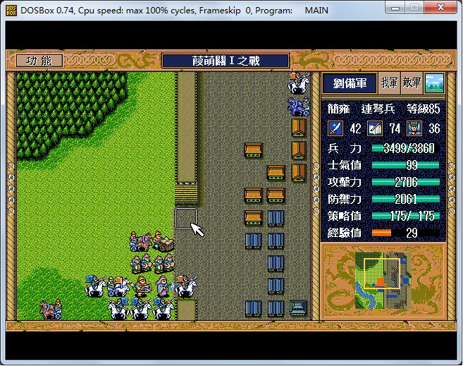基于以上4点,本人采用的思路为,利用地形及敌方近卫队配合将马超包围,只留一个方向正对我军弓兵(简雍),而张飞等可躲在弓兵身后挑拨,军乐等亦可从容布阵。马超在无法动弹而选择攻击的对象又只有简雍(85级连弩)时,每回合只能乖乖地原地激励。在需要增补策略的回合,将简雍位置换老军乐糜竺(9X级,一次回复10策略值),同时在该回合将马超士气降至20以下(保证其不攻击)。考虑到本人的情况最多只能激励26回合,所以只需让糜竺在其身边5个回合(50策略激励12次,12次+初始14次=26次)足矣。如要进一步增加,必须6回合。要实现以上目标,初始的布阵及阵型的稳定是关键。另外,为保证对马超足够的压力以及初始走位,本人让出一个名额给上关收降的近卫队吴兰出阵,最后出阵人选及顺序如下: