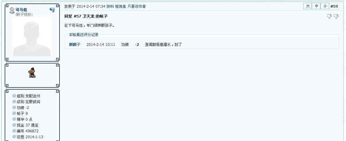 会员司马炫,利用马甲回复帖子时,具有恶意灌水行为,扣功绩两点,封禁。