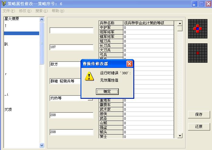 我是用6.0引擎岳飞传来改的,用落叶修改器指定职业策略,策略名乱码,而且点几下就运行错误直接退出。全局新设置的全新职业也无法显示。即一楼所述三大问题。是不是游戏人家有经过特殊处理不适合作为MOD制作学习,若如此请为我推荐一款适用于6.0引擎制作的MOD游戏。