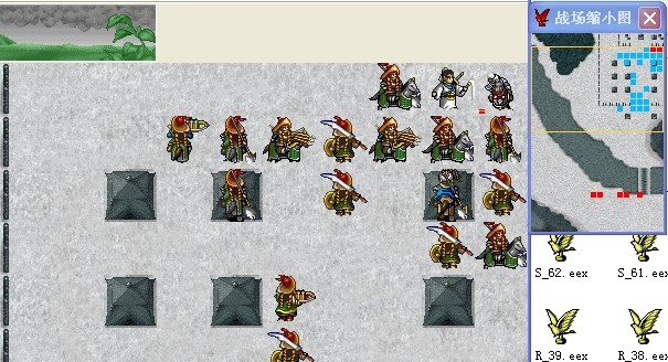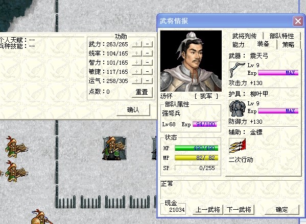 第一回合,先给汤怀分配好功勋,然后汤怀右上走攻击金兀术右边的弩兵。这里要SL下,必须保证弩兵的反击汤怀被格挡,再次行动后走到右上角落,灭掉那个弩兵,顺便升到69级。九成走到汤怀前面用强阵。这时汤怀身上防精运3个BUFF。敌方回合,2个人混乱,AI是外面的小兵先动,下面2个骑兵会上来攻击汤怀,把汤怀围住,这样金兀术就接触不到汤怀,他会进右上那个兵营对汤怀用狂风。这样汤怀只承受4次攻击,2个骑兵,金兀术的狂风,金兀术营里的一个弩兵。弩兵攻击50+,金兀术吹风100上下,2个骑兵,2个骑兵因为是背后攻击每个伤害有160上下,总伤害大概470左右,汤怀有490血,一轮下来大概还有20左右的血皮。这里不得不说天气,一开始我也没注意,后面有几个回合金兀术的狂风伤害一下子飙升到130+,汤怀直接躺了,试了几次才发现是天气因素,雨天对吹风有加成,而晴天伤害最小,69级金兀术99点MP,狂风要20点MP,所以最好保证前5回合都是晴天,否则汤怀顶不住,或者SL每次伤害都浮动到最小,可能还能剩下个位数的血皮,不过这个SL量太大,还不如SL天气比较好。